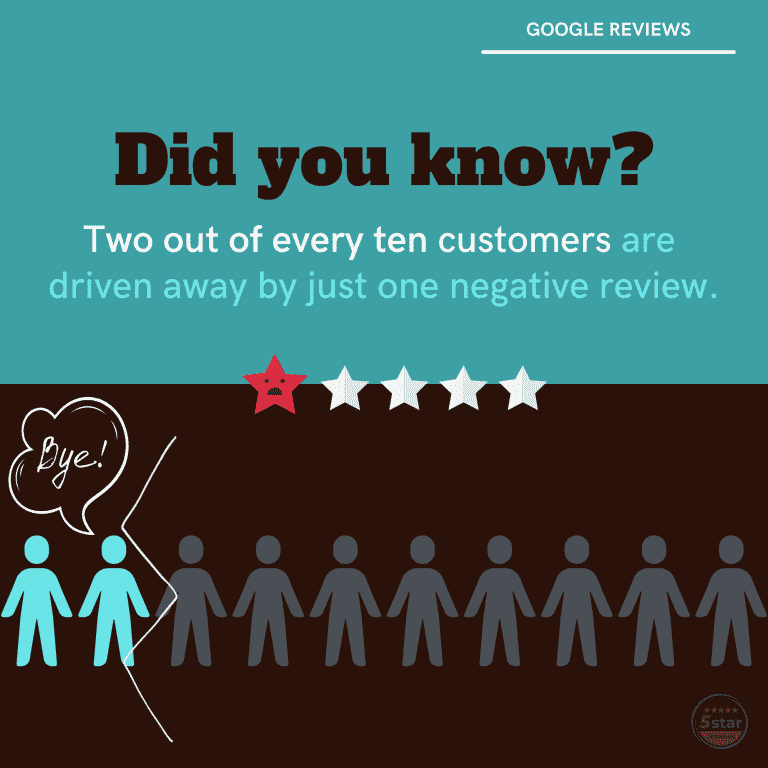 A study conducted estimated two out of every ten customers are driven away by just one negative review. If you have three negative reviews it may drive away as much as 60% of your customers; four or more, and it climbs to 70%.